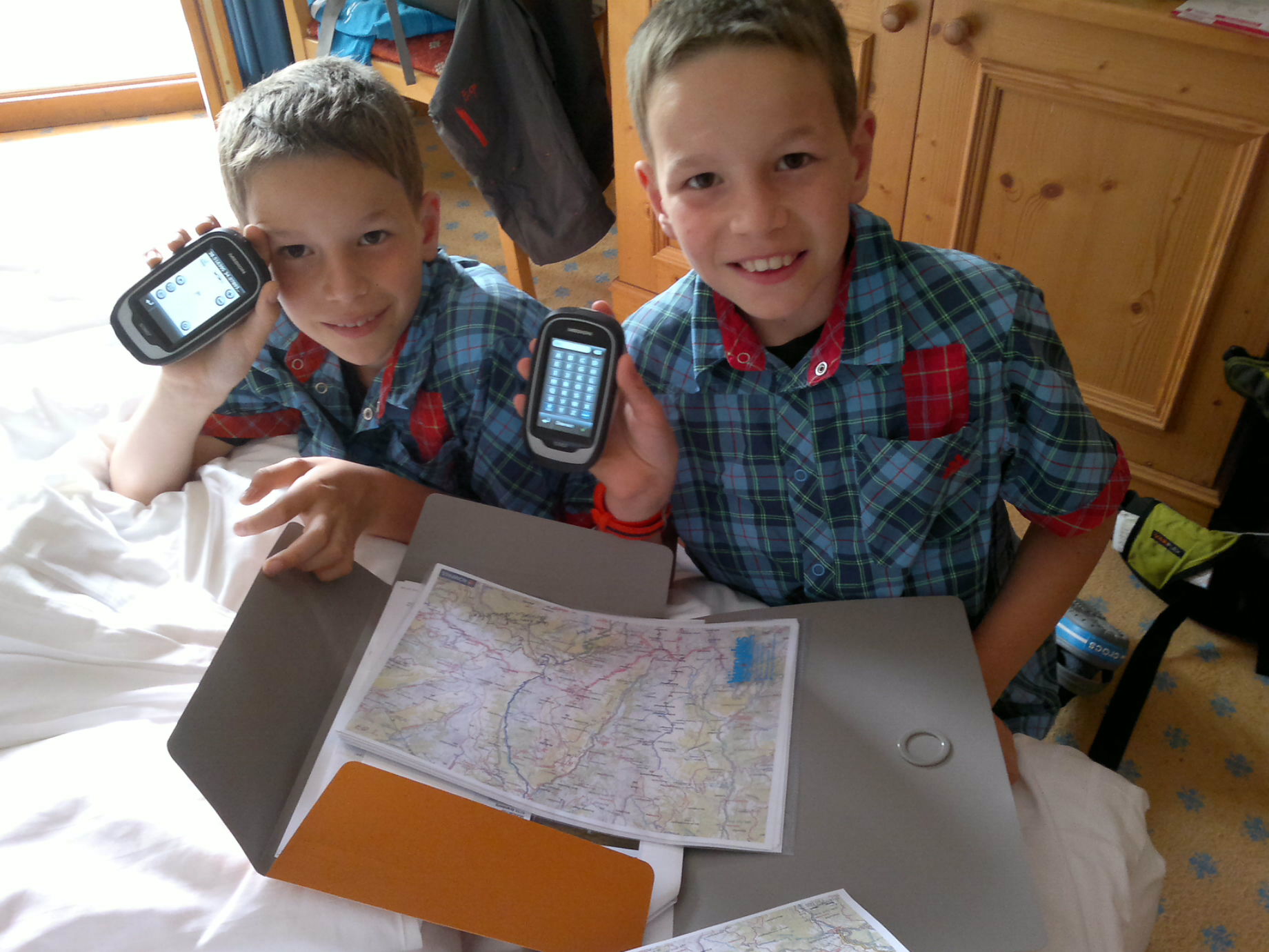 hat???? Ahhhhh, sogar liebevoll in Weihnachtspapier höchstpersöhnlich von Ihm eingepackt! Aber das juckt die 2 überhaupt nicht….das Papier ist eh in 2 sec entfernt!!! Na Endlich – Ihr eigenes Navi!!! Jetzt kann ja nichts mehr schief gehen für unsere weitere Tour ab morgen früh!!!!