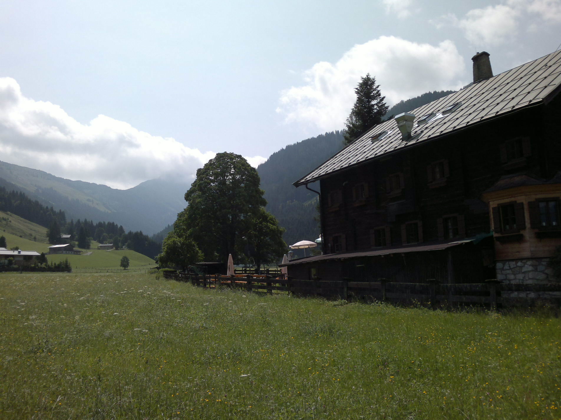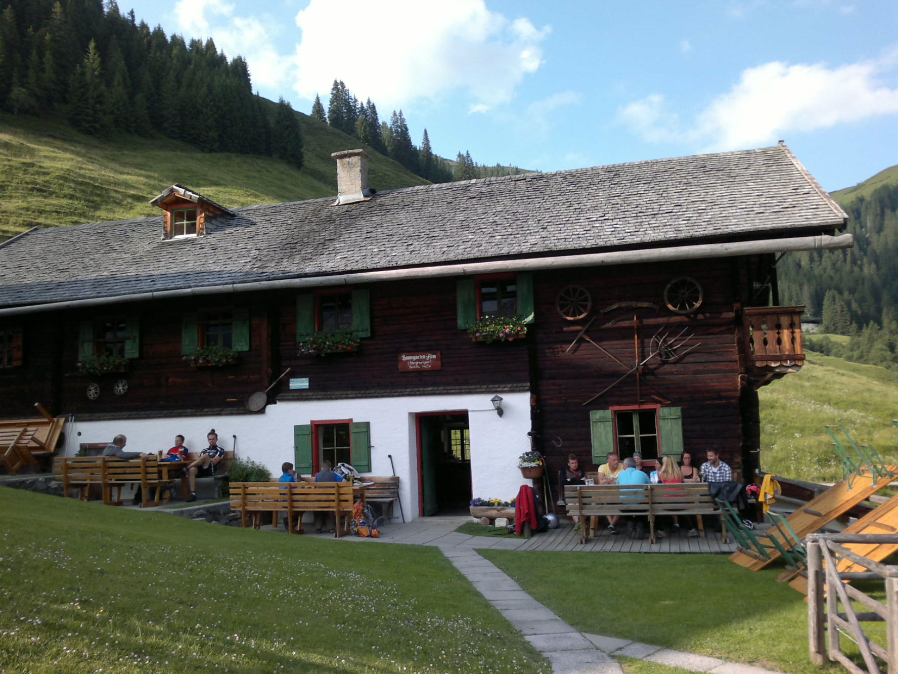 Freitag abend… 19 Uhr!! Ohhhh jeeee, auf was hab ich mich hier nur eingelassen!!! Sind hier auf der Baumgarten Alm eingekehrt… 4 Häuser drum rum, das wars…ok, Häuser iss der falsche Ausdruck…Hütten… mit Kühen und Ziegen…fehlt nur noch der Alm-Öhi!!! *lach* Abenteuer pur! Im Moment sitzen noch ein paar verirrte Mountenbike Fahrer links neben mir, und rechts vermutlich die Stamm-Gäste aus … keine Ahnung, wo die hier wohnen sollen, geschweige denn, wie die nochmal hier weg kommen!!! Gut, dann sind wir für die Nacht nicht mehr alleine hier, wie angekündigt!! Die Einweisung hier vom suuuuper netten Gastwirt war schon der Hammer! Hier sind oben die Betten, sucht euch eins aus… Toilette, Dusche für alle… Dann zum Frühstück: Kühlschrank, Brot hier, oben im Küchenschrank was Süßes, folge ihm in den Keller…. Käse, Schinken…ich soll mir nehmen was ich brauch!!! Ach ja, und dann noch der riesige Kühlschrank mit allerlei Leckerli (Weizen u.v.m.) soll mir nachher nehmen, was ich brauch!! Und was kostet die Übernachtung??? Ich soll ihm einfach hinlegen „was ich halt so denke!!!!“ Fertig!! Hammer!! Wenn wir morgen früh gehen, soll ich die Tür zuziehen…dass war’s!!!! Ja wo gibt’s denn noch sowas??? Auf der Alm!! ….ach ja, Strom iss umsonst, kommt aus dem almeigenen Kraftwerk, aber, nen Fernseher hab ich nirgens gesehen….aber das hab ich den Zwei noch nicht erzählt….aber wenn ich mich weiter mit denen am rechten Tisch unterhalte, seh ich eh nix mehr!!!!