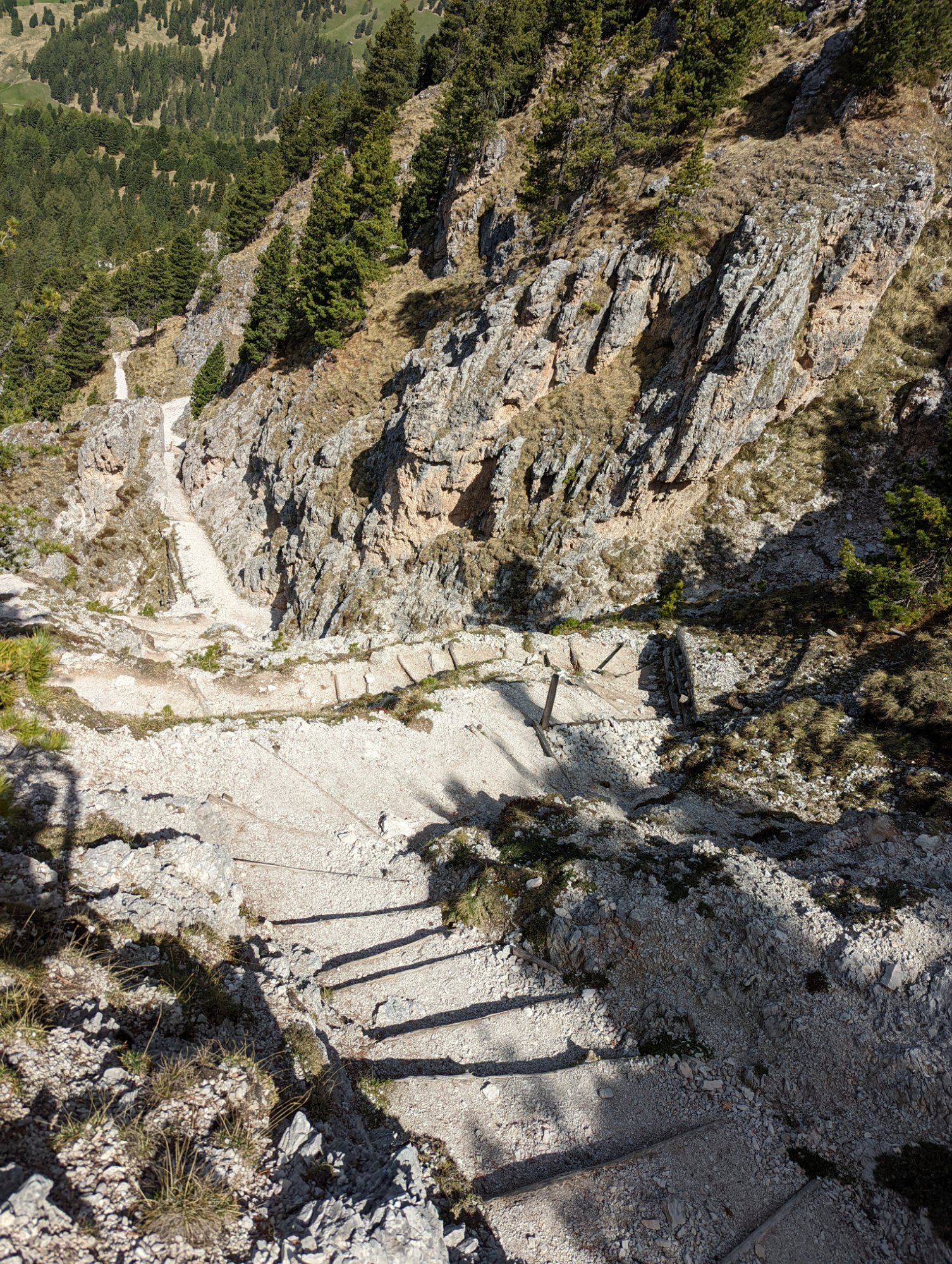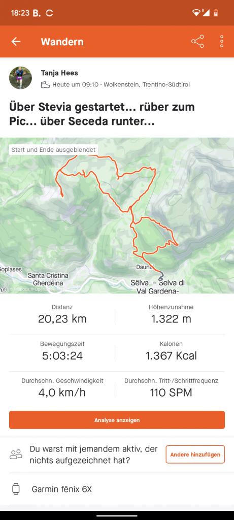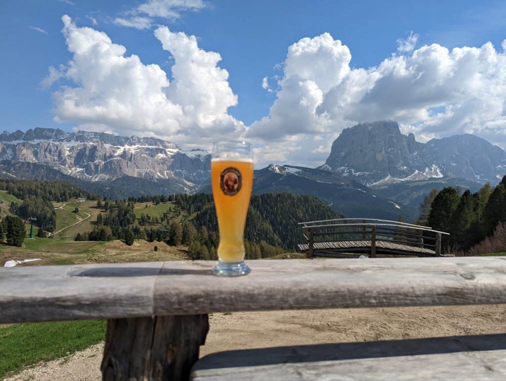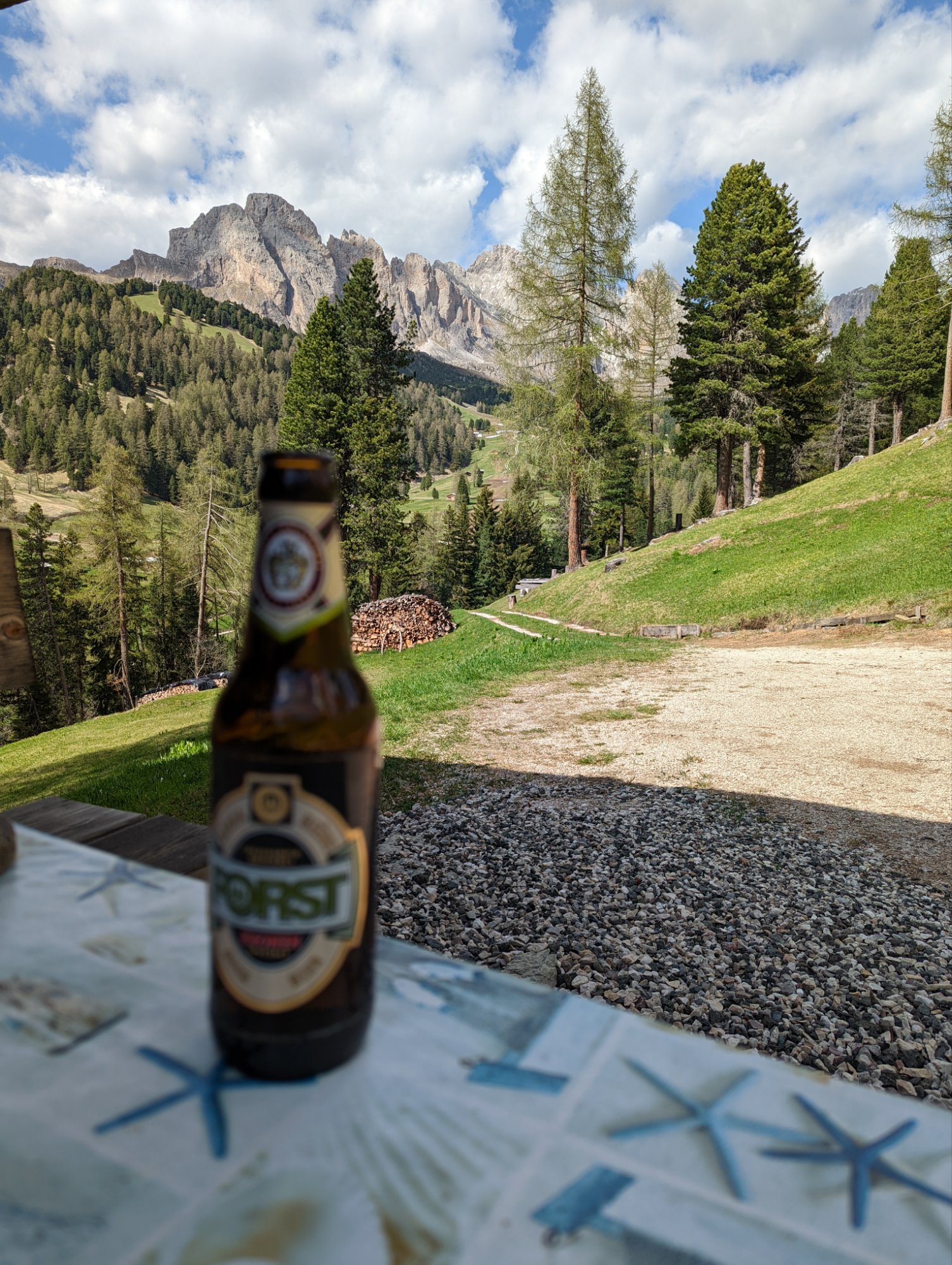 Also, schnell zurück ans Haus radeln, ein Brot essen und den schönen Nachmittag noch ausnutzen. Somit über Monte Pana hoch, bis zur Plattkofel Hütte, dann runter bis Tirler und über die Seiser Alm bis hoch zur Bergstation. Von hier entscheide ich mich, mir nen Weg Richtung St. Ulrich zu suchen, wollte nicht nochmal über Monte Pana. Allerdings bin ich über „Hartl“ ein Tal zu früh abgebogen und der tolle Schotter-Weg verändert sich in einen ziemlich steil und steinigen Wander Weg… naja…schieb ich halt etwas 🤪…im Tal bekomme ich aber noch ein Bierchen zur Abkühlung 👆