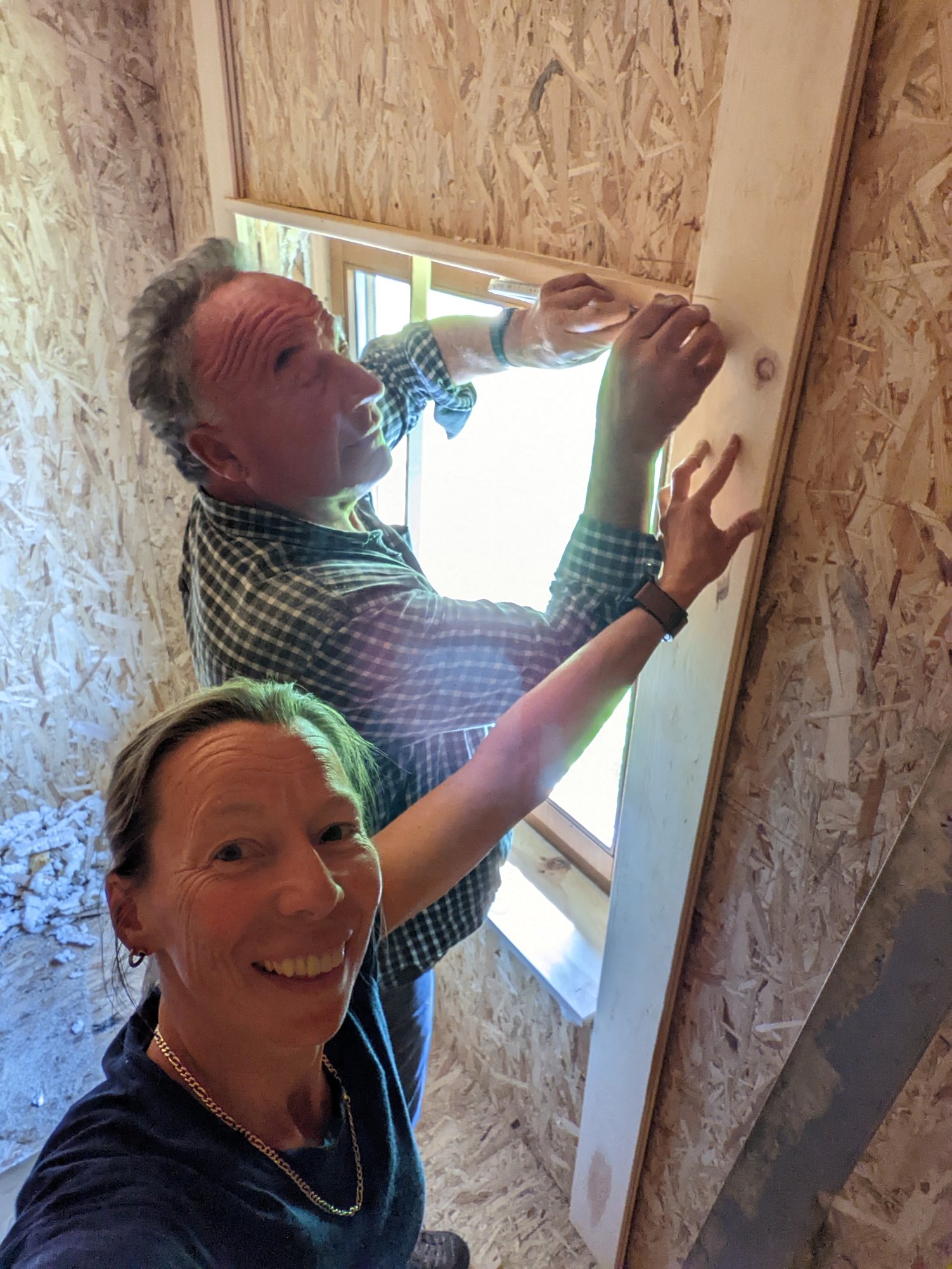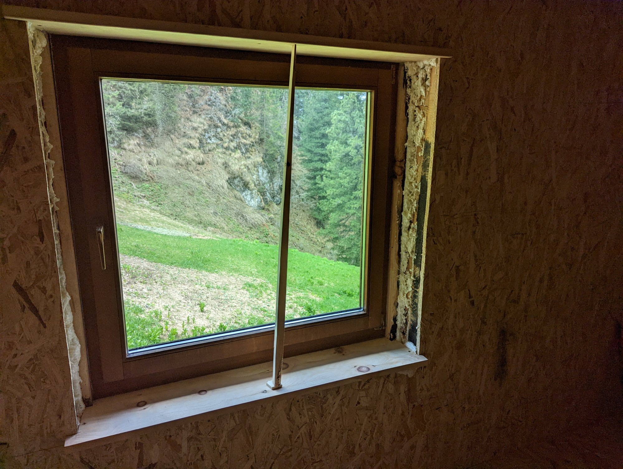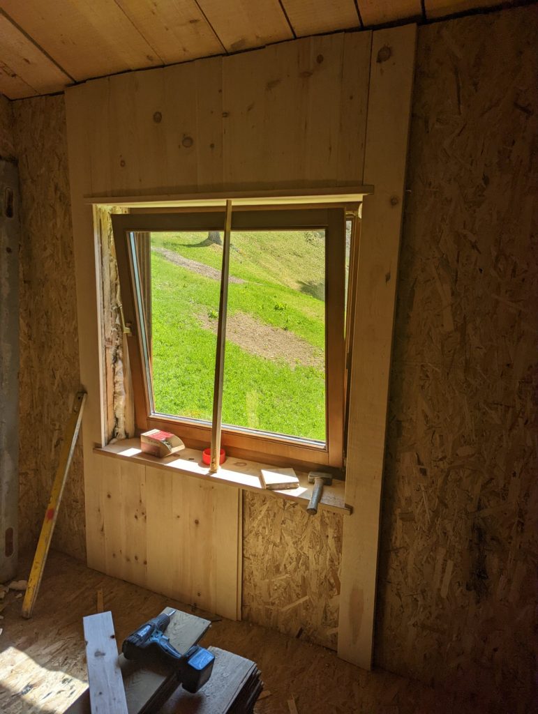 Aber zuerst mussten wir das Fenster nochmal rausholen, da dies locker nen CM schief saß und die Verkleidung außen neu anpassen. Erst dann konnte das obere Futterbrett sowie die Fensterbank eingepasst werden. Danach fing die Anpass Arbeit aufrecht links und rechts an, dann der Zuschnitt der kurzen Stücker oben und unten dem Fenster