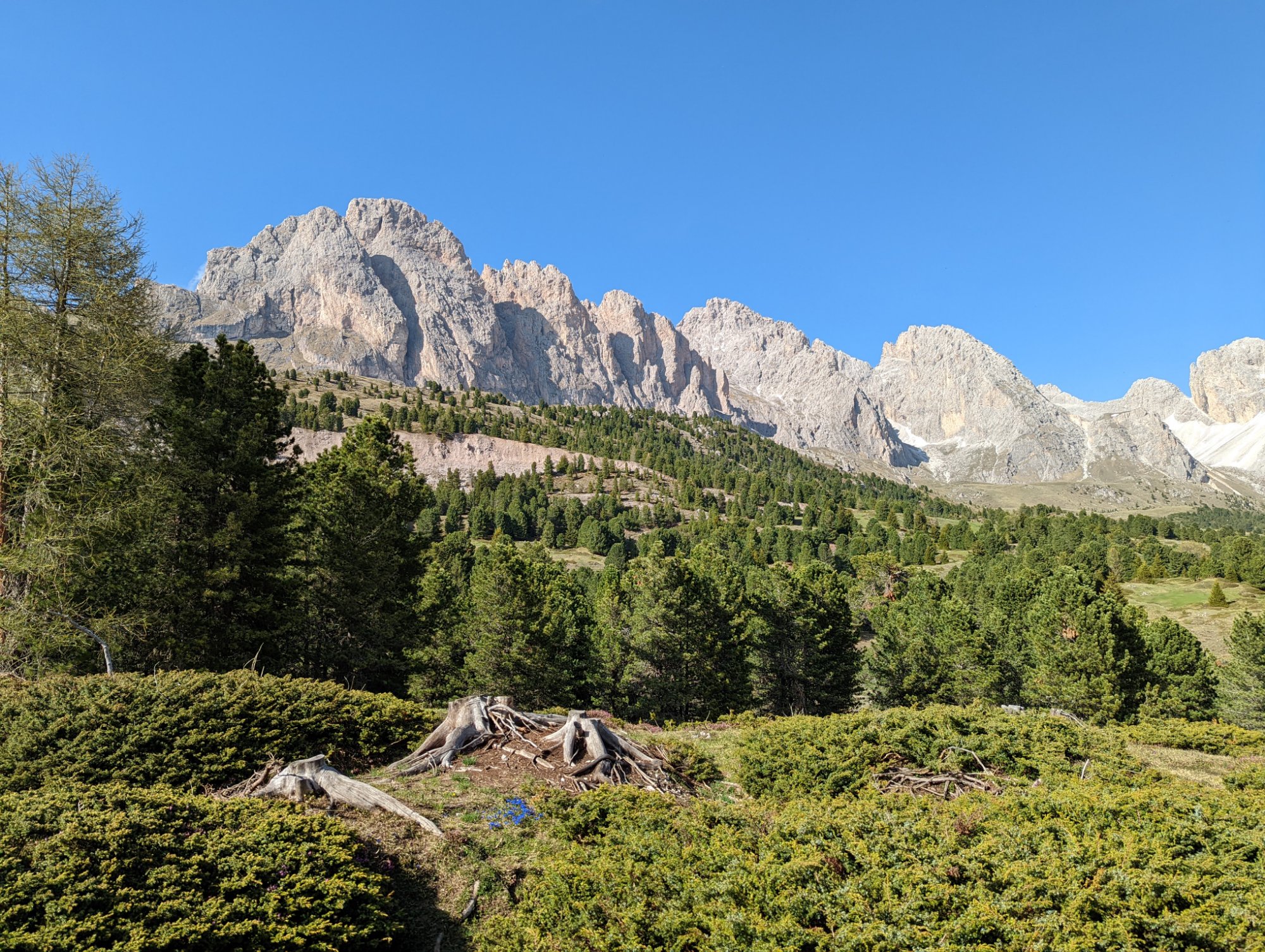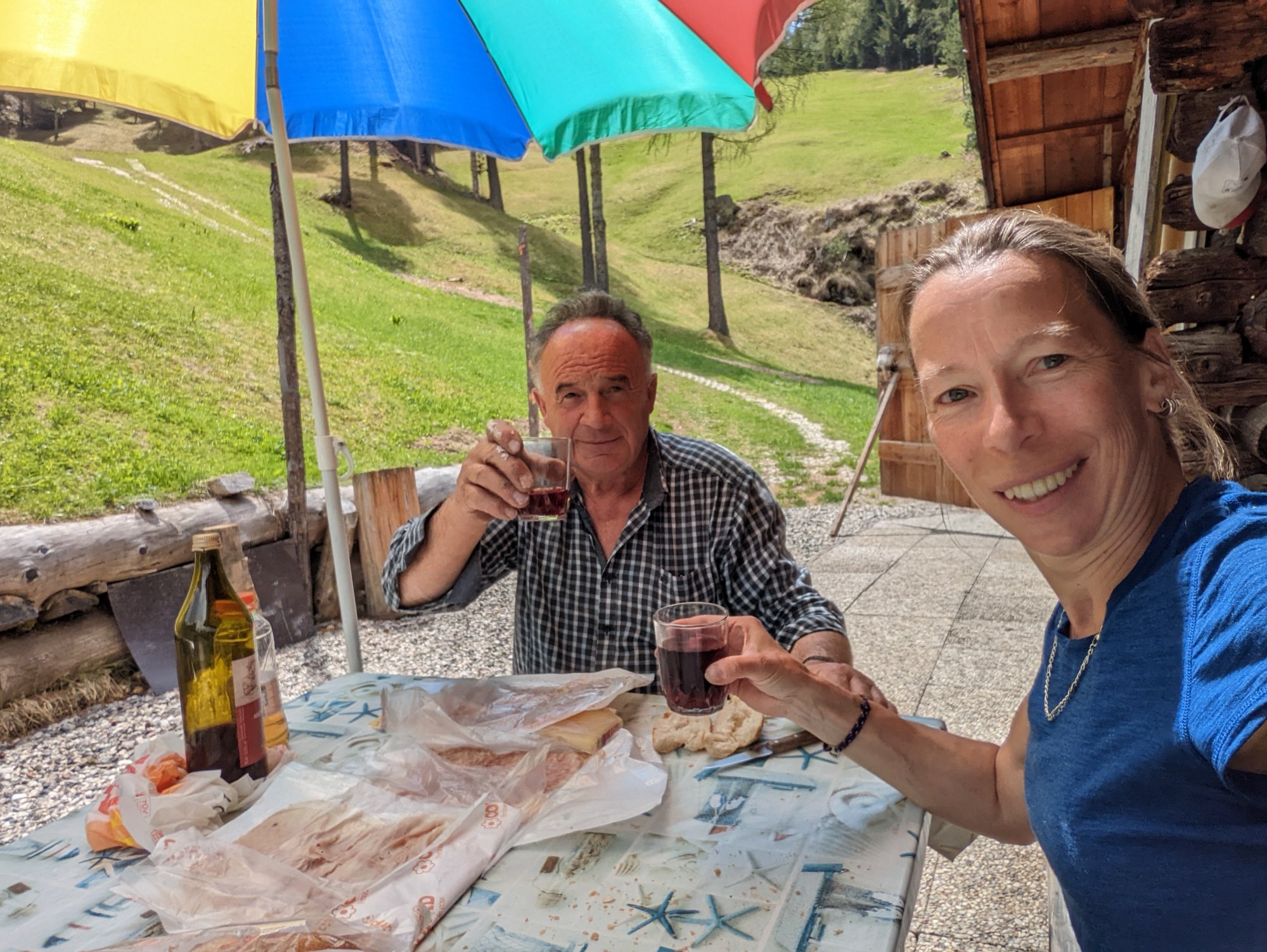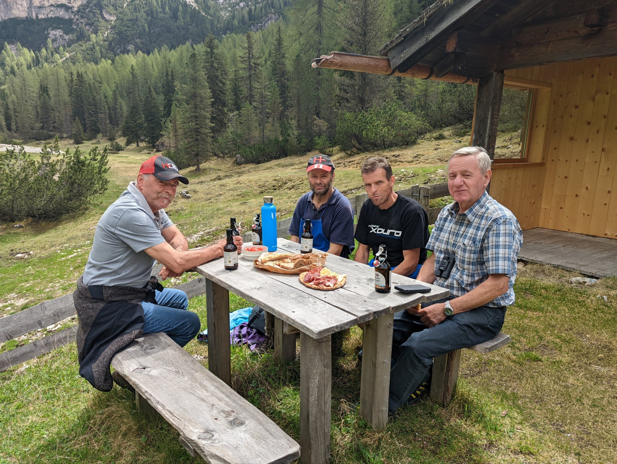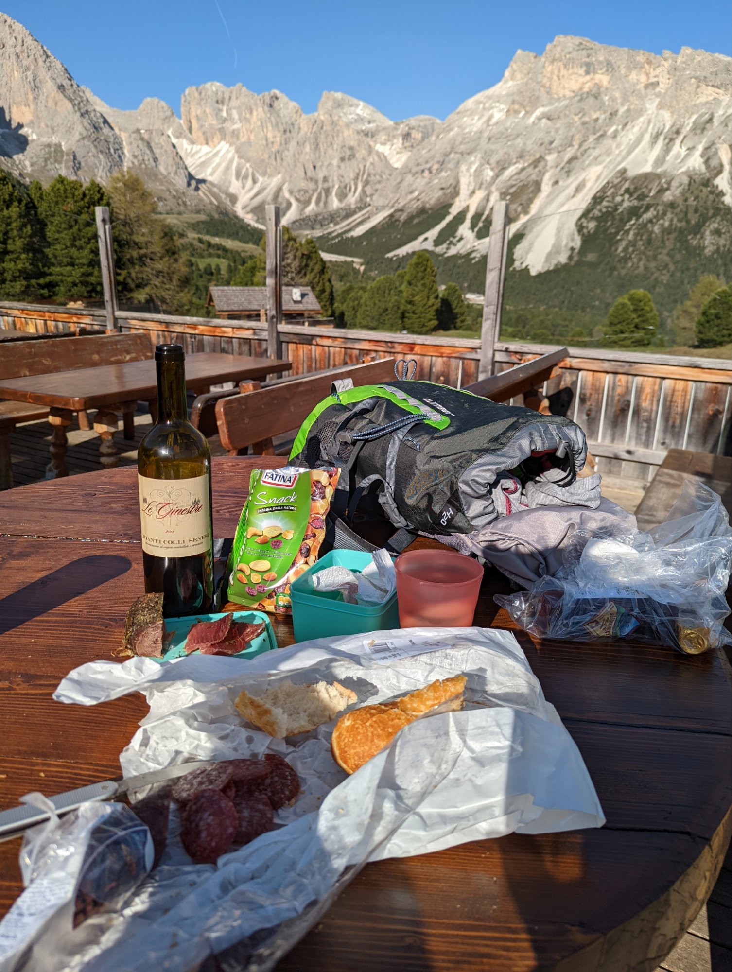 Da es den ganzen Tag super schön bleiben soll, steht wieder wandern auf’m Programm… Start über Stevia Express und Silvester Scharte runter… Die Odles Hütte soll eigentlich offen sein, da gestern die Col Raiser Bahn geöffnet hat, aber durch eine Hochzeit in der Familie geht’s halt erst morgen los….also, ohne sep. Stärkung weiter auf den Pic. Hier oben sieht es kurz nach Regen aus, also ganz schnell wieder runter…. aber da haben sich auch schon alle Wolken verzogen. Jetzt endlich gibt’s auf der Gamsblut Hütte Stärkung in allen Varianten 😄