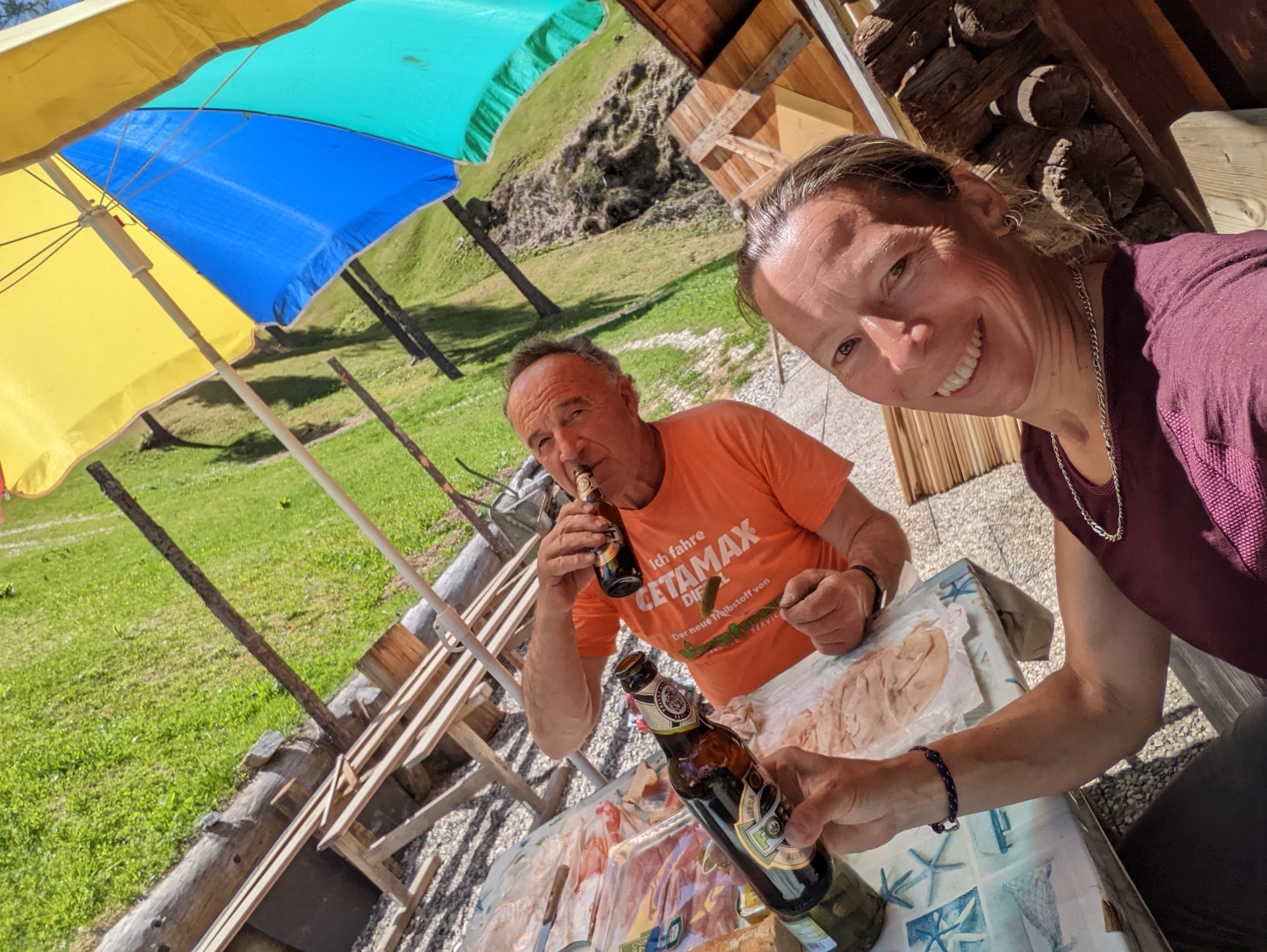 Da ich ja wusste, dass Walter ja an seiner kleinen Hütte werkeln möchte, entscheide ich mich, Mal ne Kontrollfahrt zu unternehmen. 😊 Er ist gerade dabei, seine Wiese sauber zu machen, wollte aber gleich zum Mittagessen los. Somit biete ich mich an, die linke Alm-Seite fertig zu machen. Er nimmt das Angebot gerne an. Somit habe ich locker 3,5 h in herrlicher ☀️ mit Blick auf die Nuß Schnaps Hütte, die Alm sauber gemacht 😜…ein toller Arbeitsplatz 💪 zur Belohnung gab es noch 2-3 Bier. Zum Abend gönne ich mir ausnahmsweise mal ne Pizza… inzwischen haben ja doch schon 2 Pizzarien geöffnet.