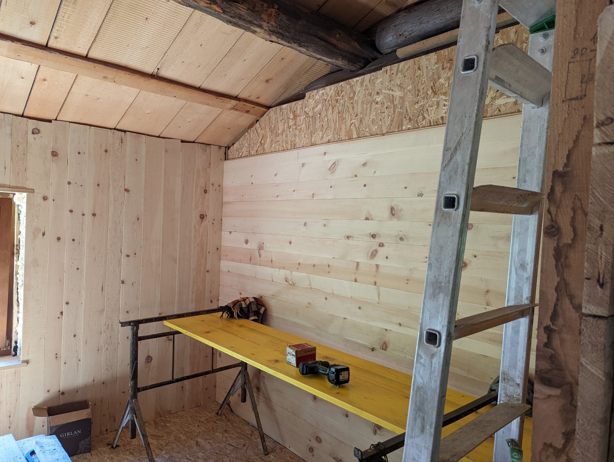 Die Hütte liegt einfach genial„Besuch“ auf der WieseWand vor Kopf ist fertigGegen Mittag auch die 1. Seitenwand… wir räumen somit Resthölzer und Abfallstücke rumOhne Mittagessen geht gar nix 😄Gegen 15 Uhr haben wir auch die 2. lange Wand fertig… Walter ist Happy