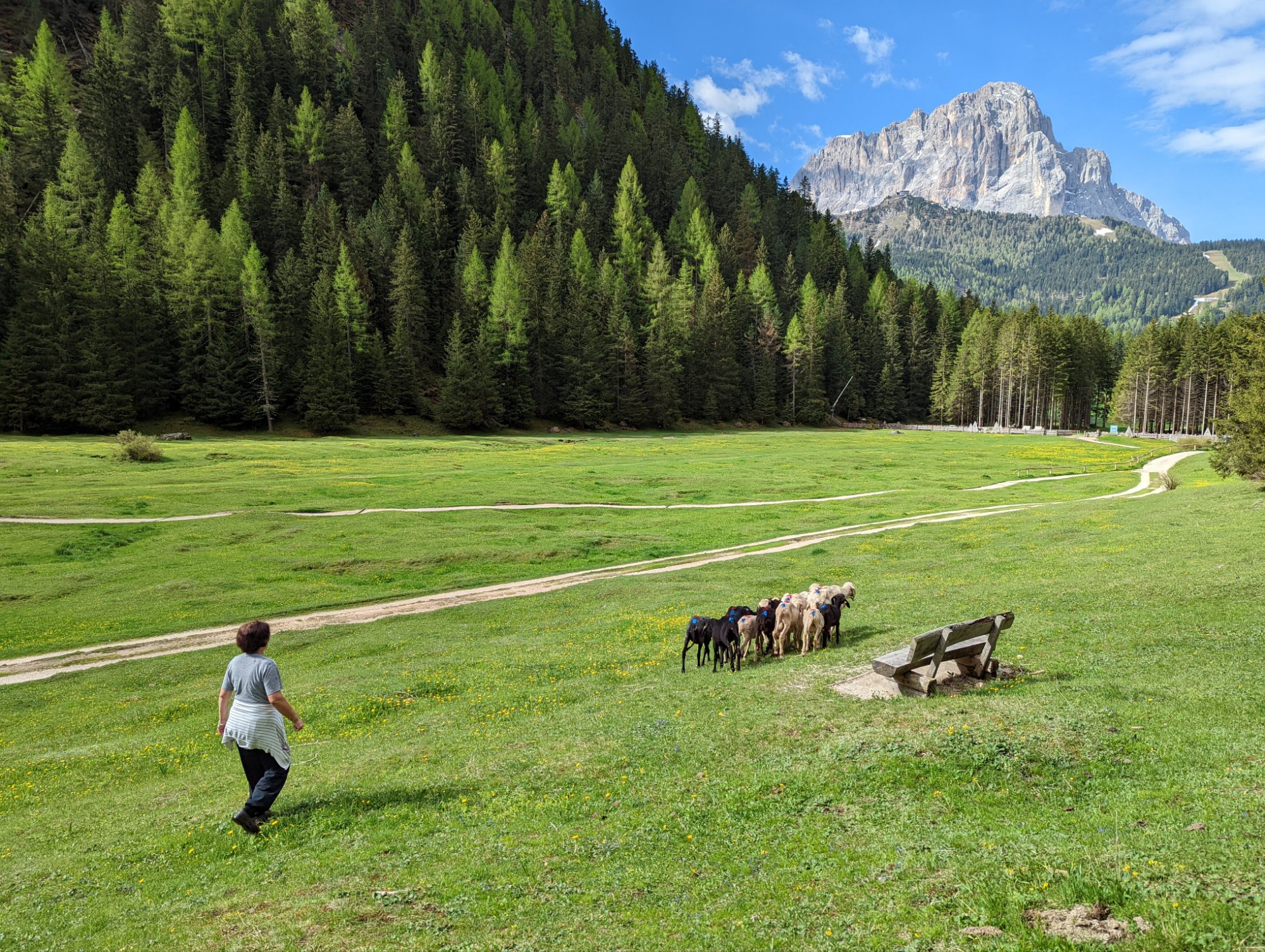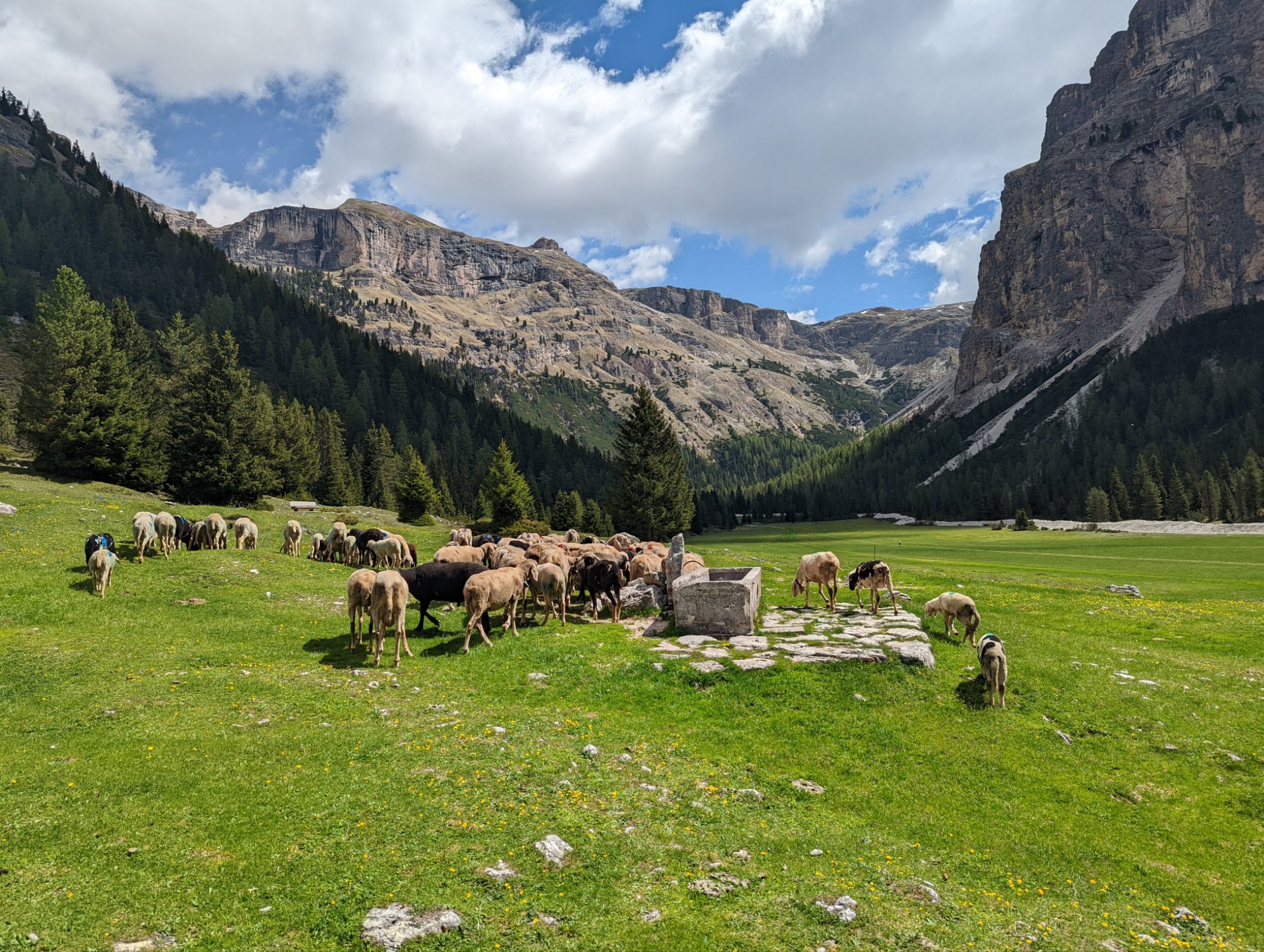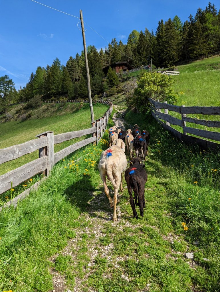 Gestern morgen kam Georg, dass er sich heute morgen um 9 Uhr auf den Weg ins Langental macht und seine ersten 14 Schafe somit raus bringt. Somit stehe ich Punkt 9 Uhr auf seinem Hof. Endlich kann ich mal den Viehtrieb hautnah erleben. Ich bekomme den Platz zugewiesen, wo ich gleich 2 Stellen absichern muss…er ist der Meinung, ich könnte am schnellsten zur anderen Hof Ecke laufen 🤣. Zum Glück wissen diese Schafe absolut genau Ihren Weg. Nach 50m über die Straße biegen sie ordentlich links in den Kuhkackweg ab. Ich gehe schön hinterher. Georg ruft von unten, wir sollen langsam machen 🤣👆. …sag das mal den Schafen. Dann biegen wir rechts in den Kreuzweg ab. Inzwischen ist Georg aufgeschlossen. Hier geht es jetzt drüber bis zum Beginn des Langentals. Hier wartet Ingrid, um die Schafe durch die Hecken auf die Wiese hinter dem Parkplatz abbiegen zu lassen. Kurz kommen die Schafe jetzt nochmal in ein Gehege, bis auch der 4. Bauer seine Schafe gebracht hat. Jetzt werden alle 79 Schafe zusammen rein ins Langental getrieben, bis auf die berühmte Almwiese mit dem dicken Stein. Das klappt alles ziemlich reibungslos. An der Alm wartet schon die Frau vom Scharf Hirte Leo, die bereits Essen und Trinken bereit hält… somit gibt’s für uns noch richtig lecker ne Brotmahlzeit ☺️ perfekt. Und die Geschichten rund um die Scharfe, wo sie diese schon überall gefunden haben, oder auch leider schon abgestürzt sind oder gar vom Wolf gerissen, sind super interessant. Nach einem ausführlichen Mittagessen, gehen Georg und ich zurück…. Ach ja, mit dem „berühmten“ Hirten, über den es in Servus TV auch einen Film gibt, nimmt mich mit, wenn er die Scharfe weiter Richtung Puez bringt ☺️☺️☺️ *freu“