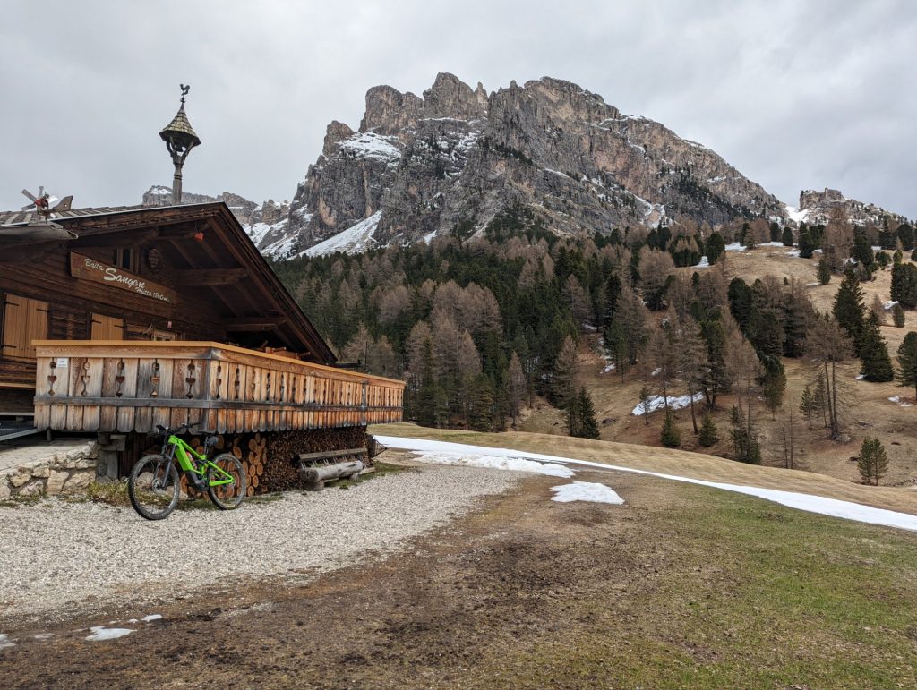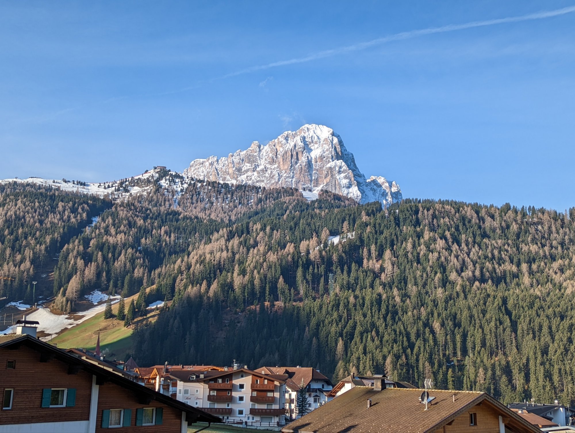 Mein Nuß Schnaps Wirt ist noch im WinterschlafWeiter hoch ging es heute leider nicht mehr…das Schneeband ist noch der Pisten-RestMein Freund, der Langkofel trägt wieder weiß