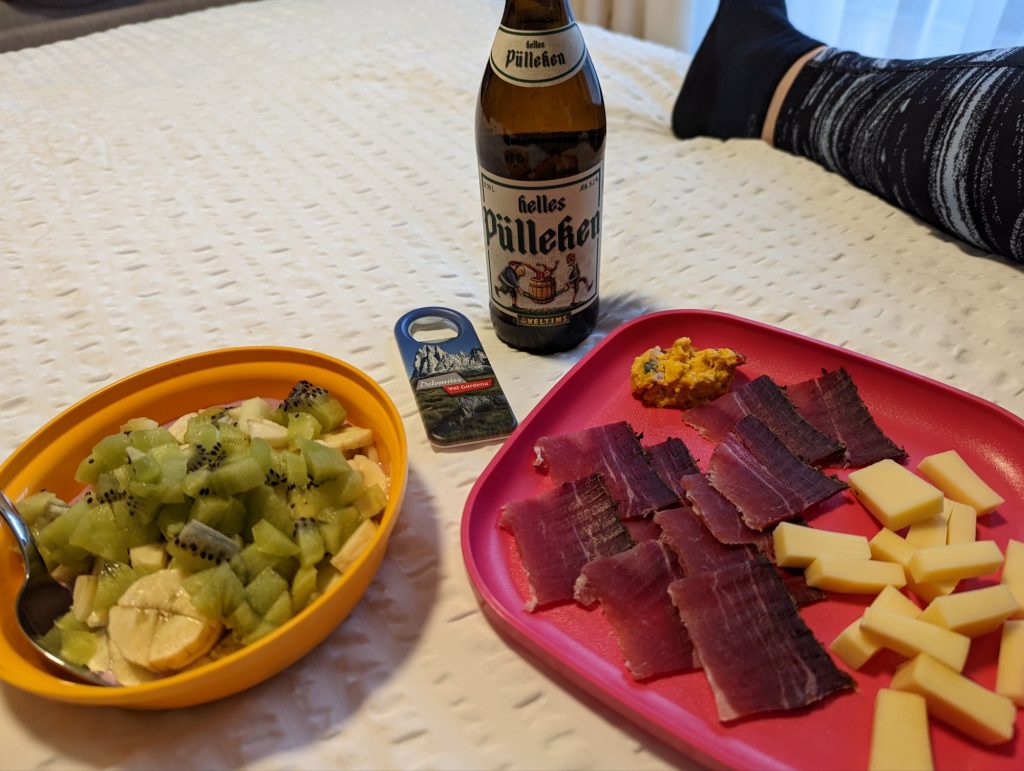 Zum Nachmittag schreibt mich Mjriam an, ob ich nicht Lust habe, mit Ihnen Abend zu essen. Natürlich mache ich das viel zu gerne 😊. Da Mjriam auch Flüchtlinge aus der Ukraine aufgenommen hat, (Ihre jährlichen Wintergäste) kommen noch 3 Personen mehr an den Tisch und es entwickelt sich eine sehr interessante Unterhaltungsmethode 😄. Alle zusammen können wir in Englisch reden, Guido kann aber auch recht gut russisch und so unterhält er sich gerne auch in deren Sprache. Mit Mjriam und Guido spreche ich in Deutsch – und wenn nur die beiden miteinander gesprochen haben, dann in Ladinisch. Das war ein super nettes und freundliches Abendessen… mit noch einem bis zwei Absacker 🤪